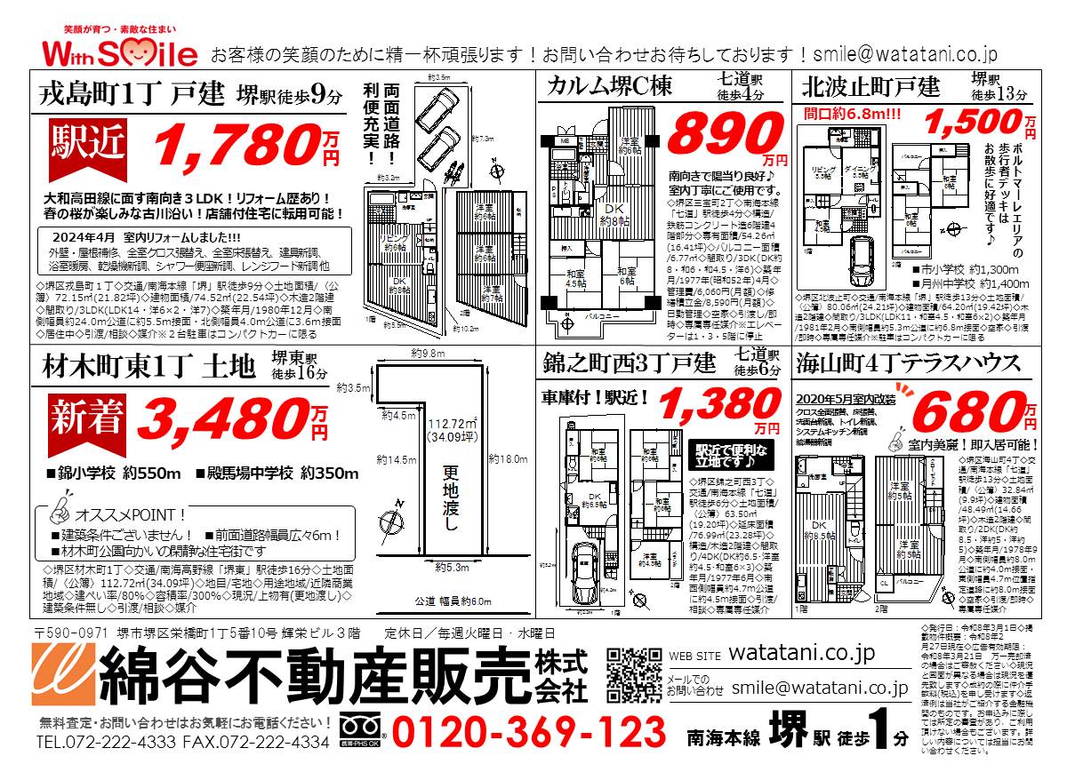 『堺住人』この街"堺"に住みたい人がいます!堺密着の不動産営業を30年続けております!堺の不動産は、堺区生まれ堺区育ちの綿谷にお任せください。売却不動産・賃貸テナント大募集!!ご成約まで全て無料!ご相談はお気軽にお電話ください!お待ちしております。