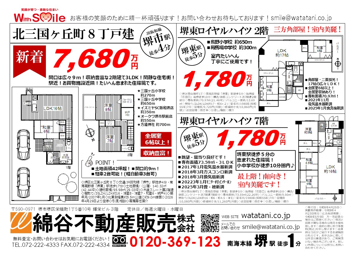 『堺住人』この街"堺"に住みたい人がいます!堺密着の不動産営業を30年以上続けております!堺の不動産は、堺区生まれ堺区育ちの綿谷にお任せください。売却不動産・賃貸テナント大募集!!ご成約まで全て無料!ご相談はお気軽にお電話ください!お待ちしております。