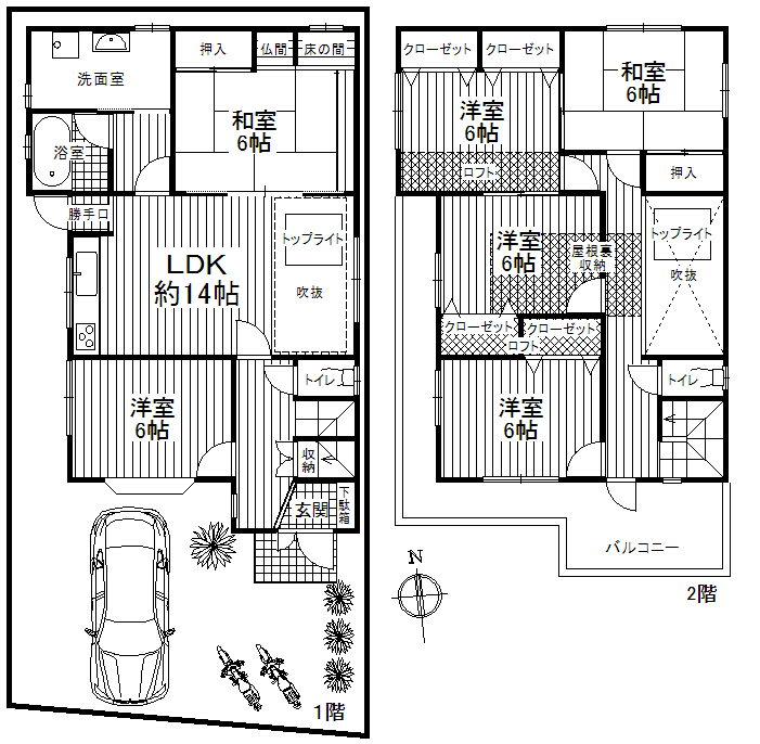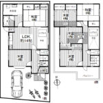 | 間取内容 | 1階LDK14畳1室 1階洋室6畳1室 2階洋室6畳2室 1階和室6畳1室 2階和室6畳1室 |