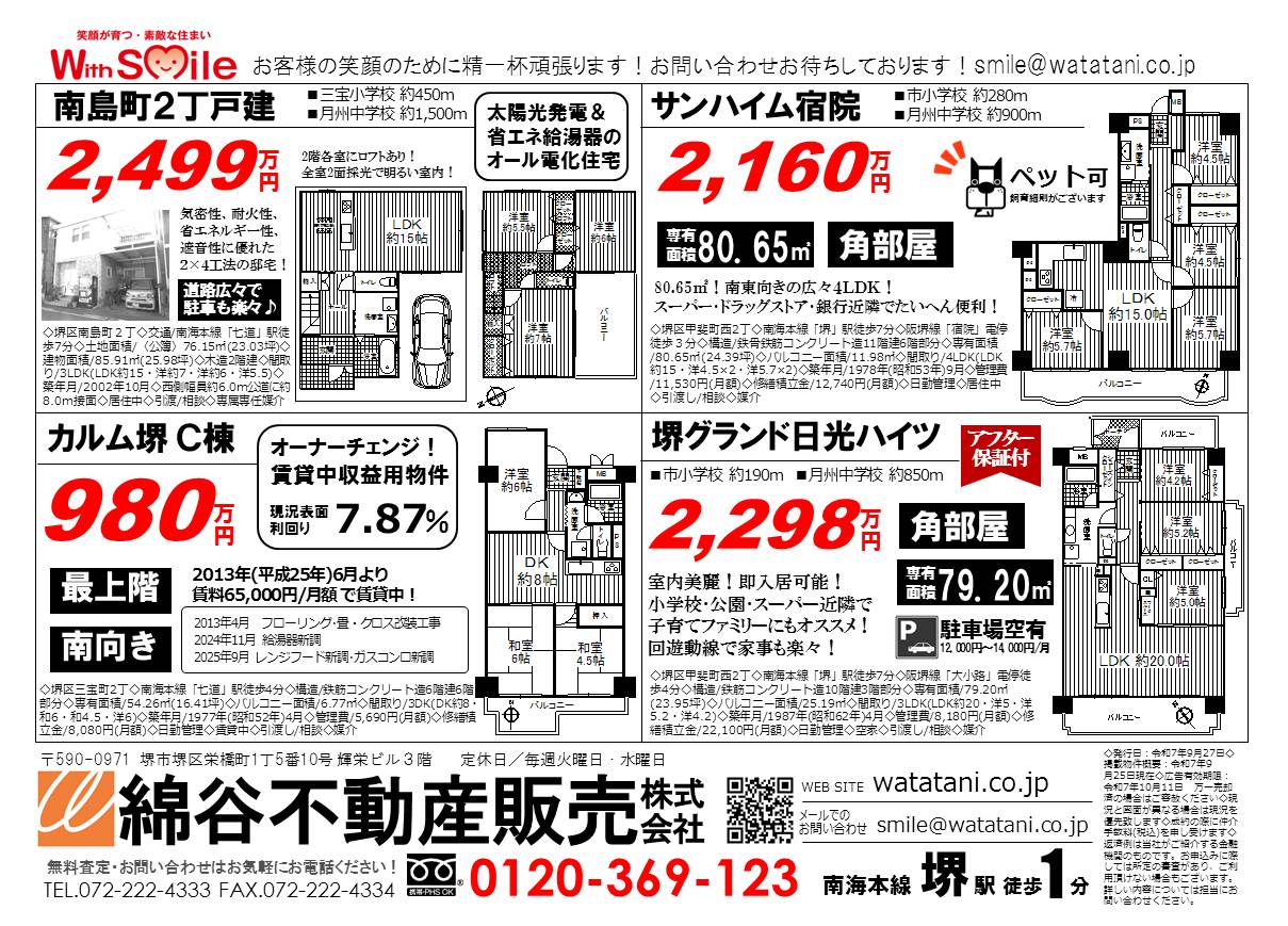 今週のチラシ 速報!先出し!今週のチラシ 2025.9.26 Update! 当店おすすめ物件 ★大変丁寧にご使用です!駐車スペース有り!堺市堺区山本町5丁倉庫 ★堺旧市内では希少な南向き!41坪!建築条件なし!堺市堺区櫛屋町東3丁土地 ★室内全面リフォーム!南東角部屋!上階住戸なし!レックスマンション浅香山